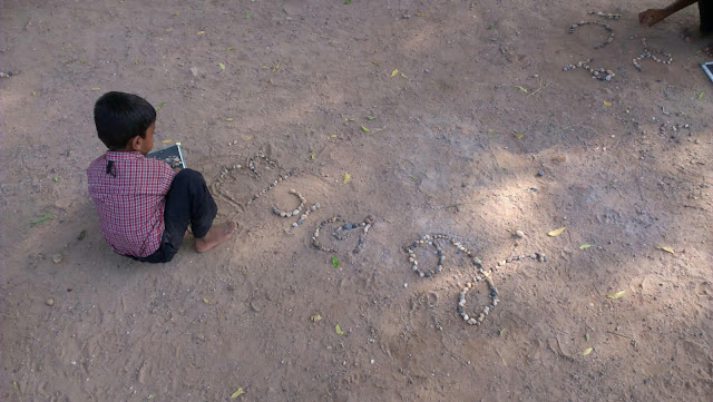 Student of Pragna std. 3/4. Making kakko with stone.....